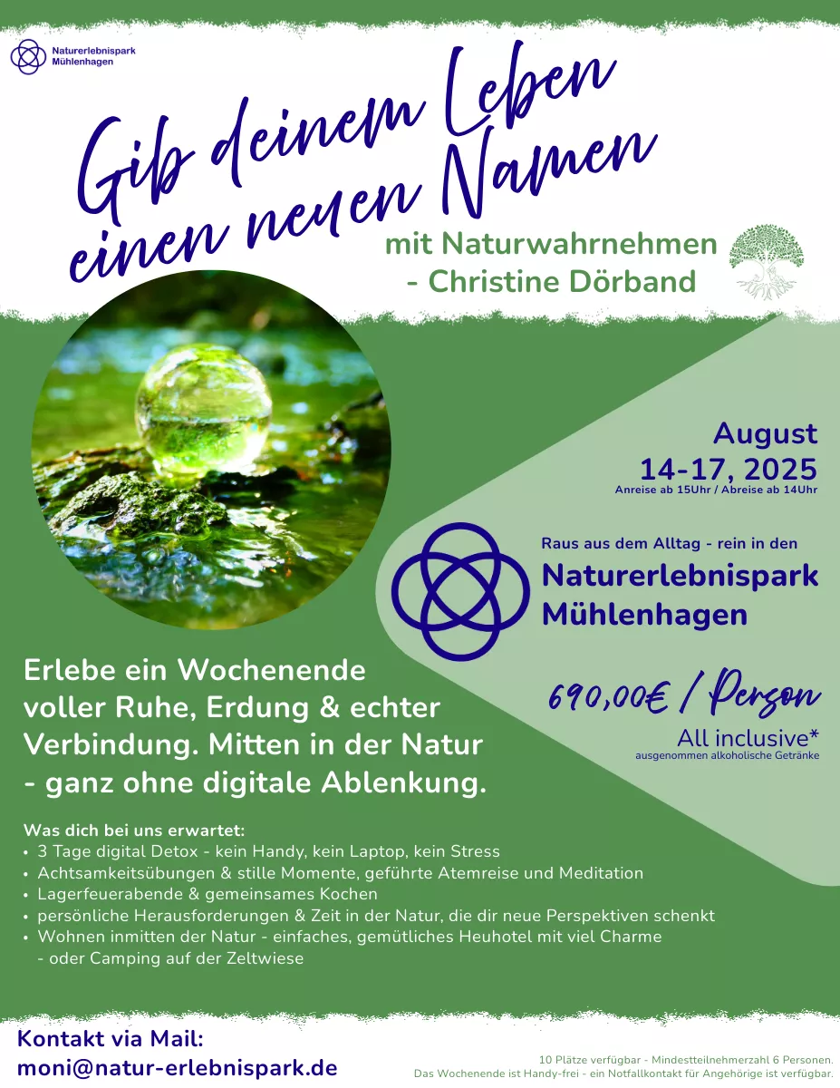- Naturerleben & Achtsamkeit: Atemübungen, stille Momente, geführte Meditationen – alles draußen, mitten im Grünen.